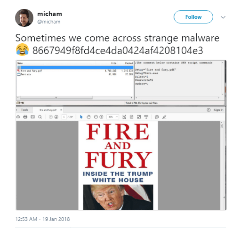 Researchers discovered malware on the pirated digital version of Michael Wolff’sFire and Fury inside the Trump White House book which can grant hacker’s remote access to reader’s PC.The malware was first highlighted by Kaspersky Lab researcher Michael Molsner and reported by Daily Beast.